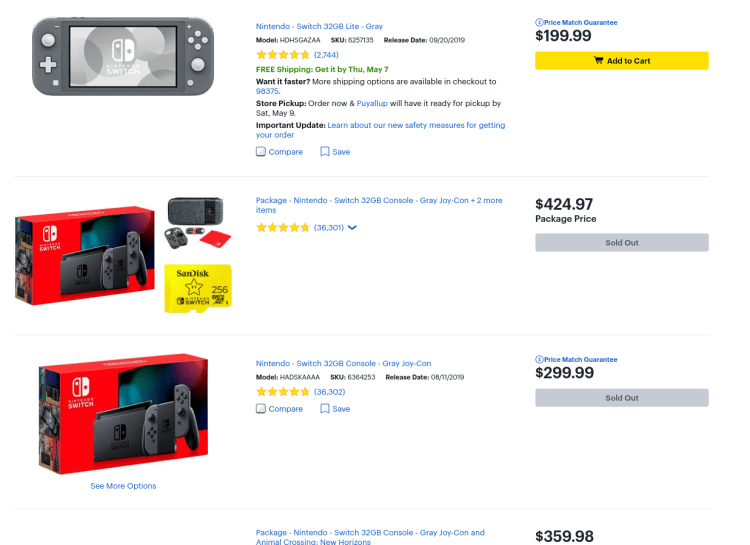 Nintendo Switches are sold out, expcet for switch lites, which is beacuse of everybody needing something to do during the lockdown. If you want a switch now, ebay has some regualr switches in stock.